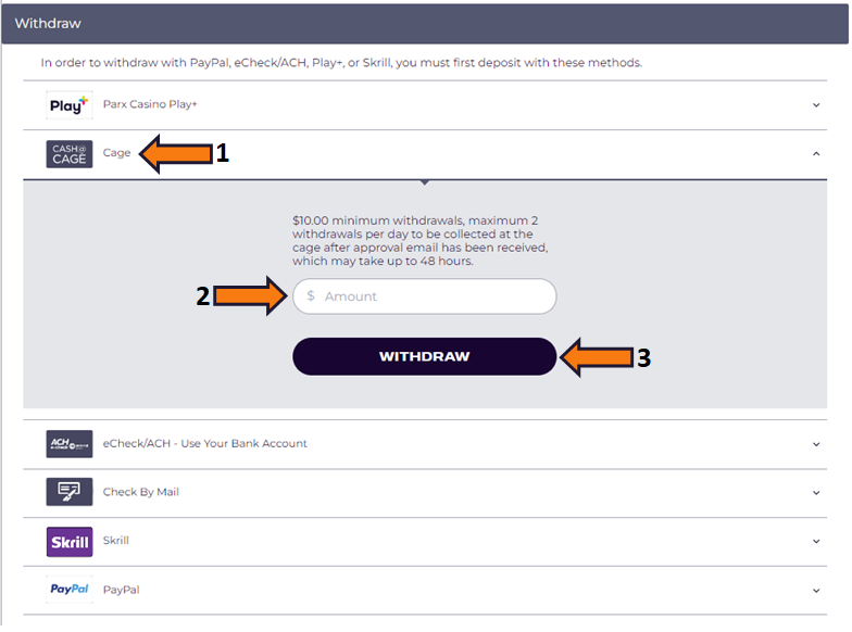 You can make a Cash @ Cage withdrawal by making a request on the 'Banking' page of your account. Please login and go to the 'My Account' section: